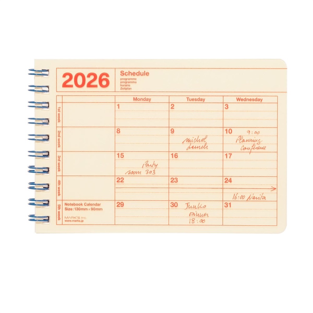 Página por mes, con espacio en cada día del mes para pequeñas anotaciones. Incluye las Fiestas de 9 países marcadas en rojo.