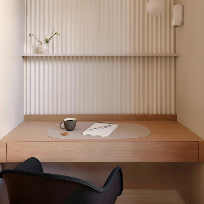 Individual de mesa práctico, sobrio y elegante con una superficie de fácil limpieza. Es un producto sostenible y duradero, hecho a mano con cuero 100% reciclado.