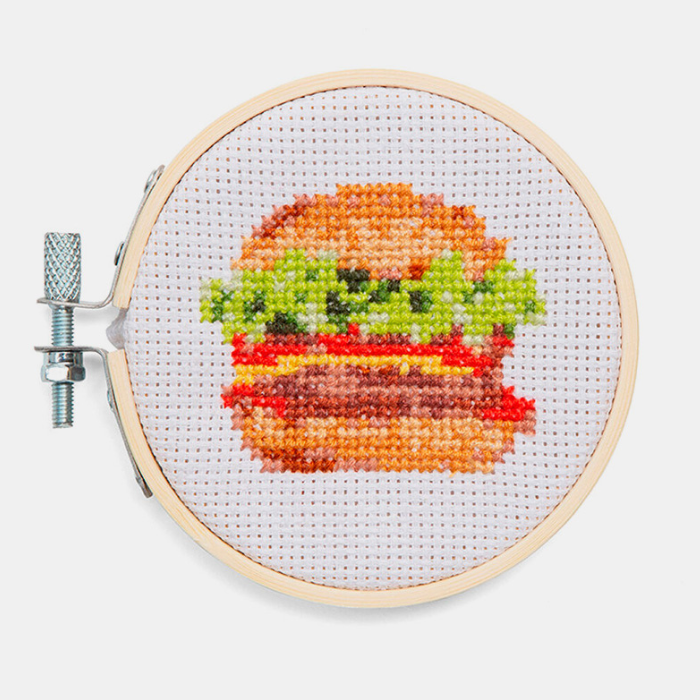 El Mini kit de bordado punto de cruz con diseño de hamburguesa de Kikkerland contiene todo lo necesario para bordar una hamburguesa en punto de cruz: aro, tela preimpresa, hilos de colores, aguja e instrucciones. Tamaño compacto ideal para principiantes o para llevar de viaje.