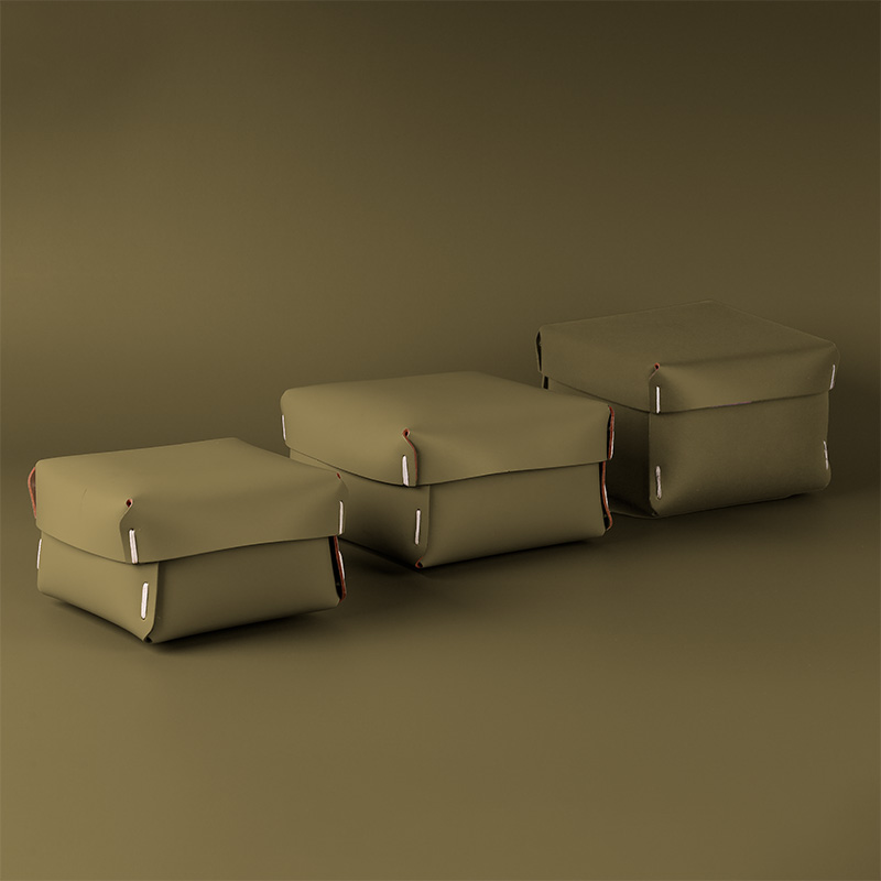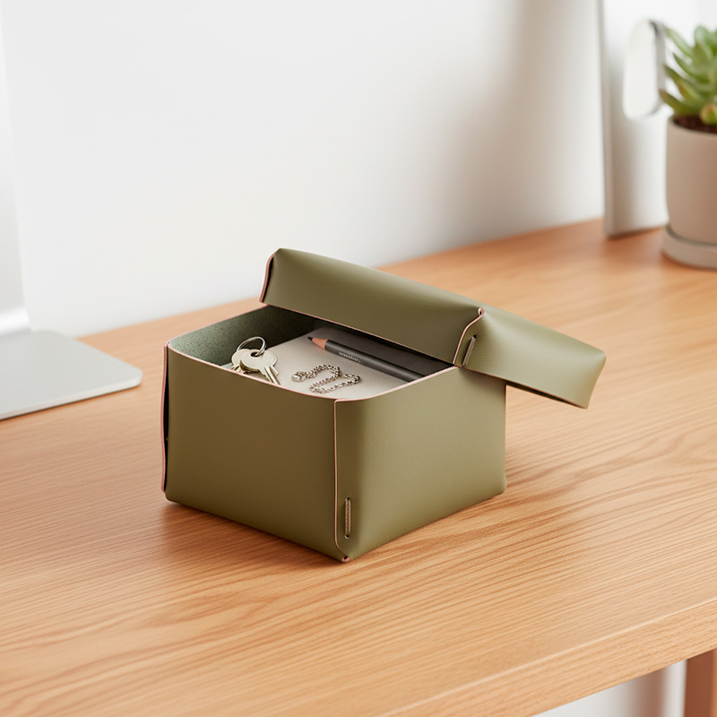 Caja mediana, multiuso, ideal para organizar y ordenar tus espacios. Es un producto sostenible y duradero, hecho a mano con cuero 100% reciclado.