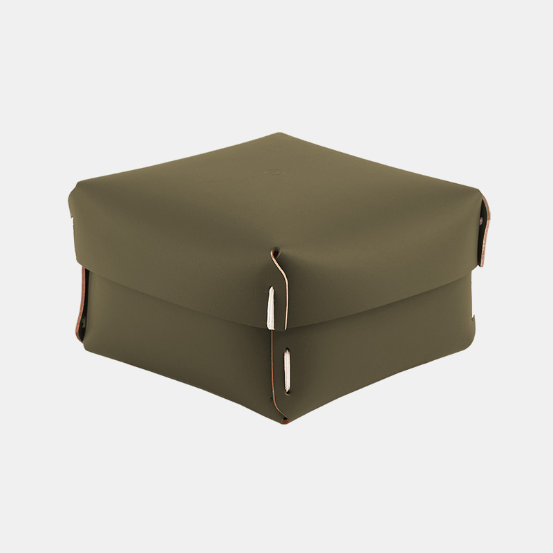 Caja mediana, multiuso, ideal para organizar y ordenar tus espacios. Es un producto sostenible y duradero, hecho a mano con cuero 100% reciclado.