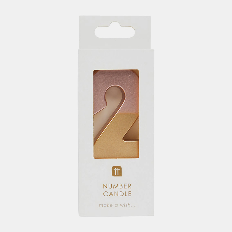 Añade un toque elegante a tartas de cumpleaños o aniversarios con esta vela número 2 en tonos rosa y dorado. No contiene purpurina, lo que la hace más ecológica.
