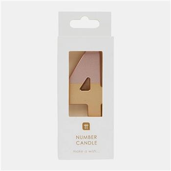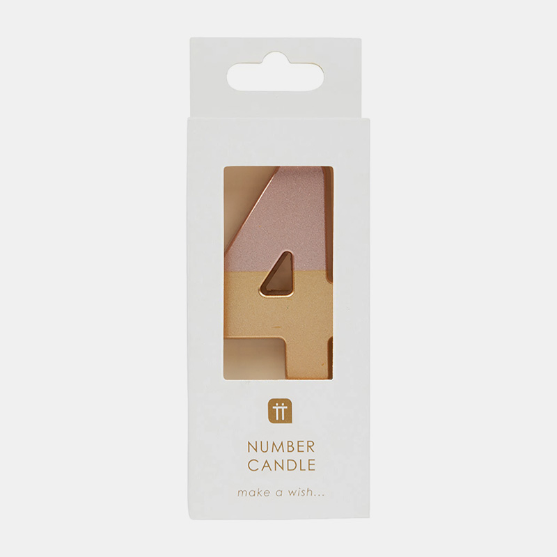 Añade un toque elegante a tartas de cumpleaños o aniversarios con esta vela número 4 en tonos rosa y dorado. No contiene purpurina, lo que la hace más ecológica.