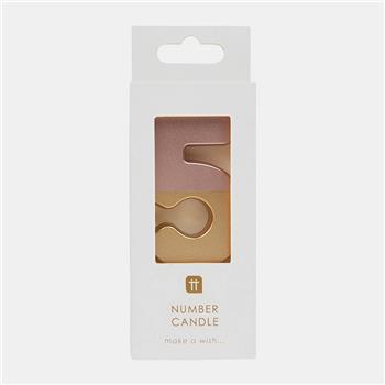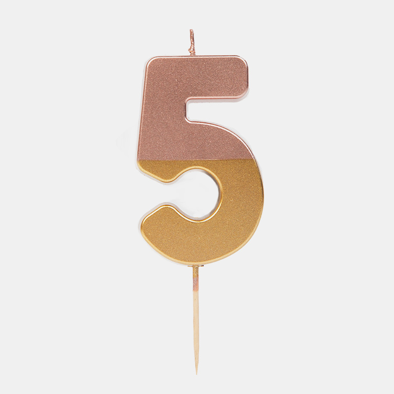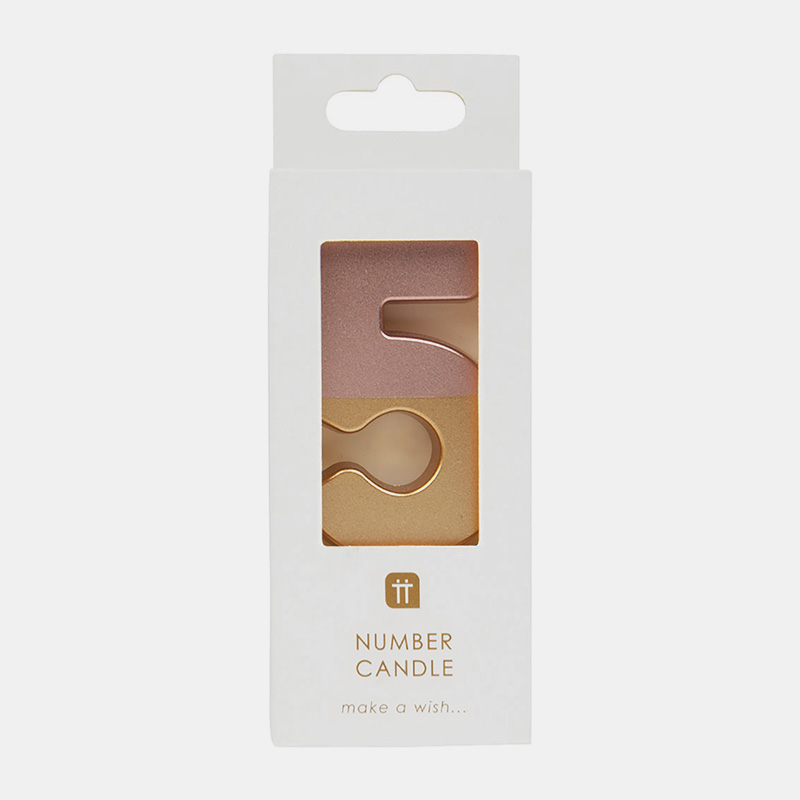 Añade un toque elegante a tartas de cumpleaños o aniversarios con esta vela número 5 en tonos rosa y dorado. No contiene purpurina, lo que la hace más ecológica.