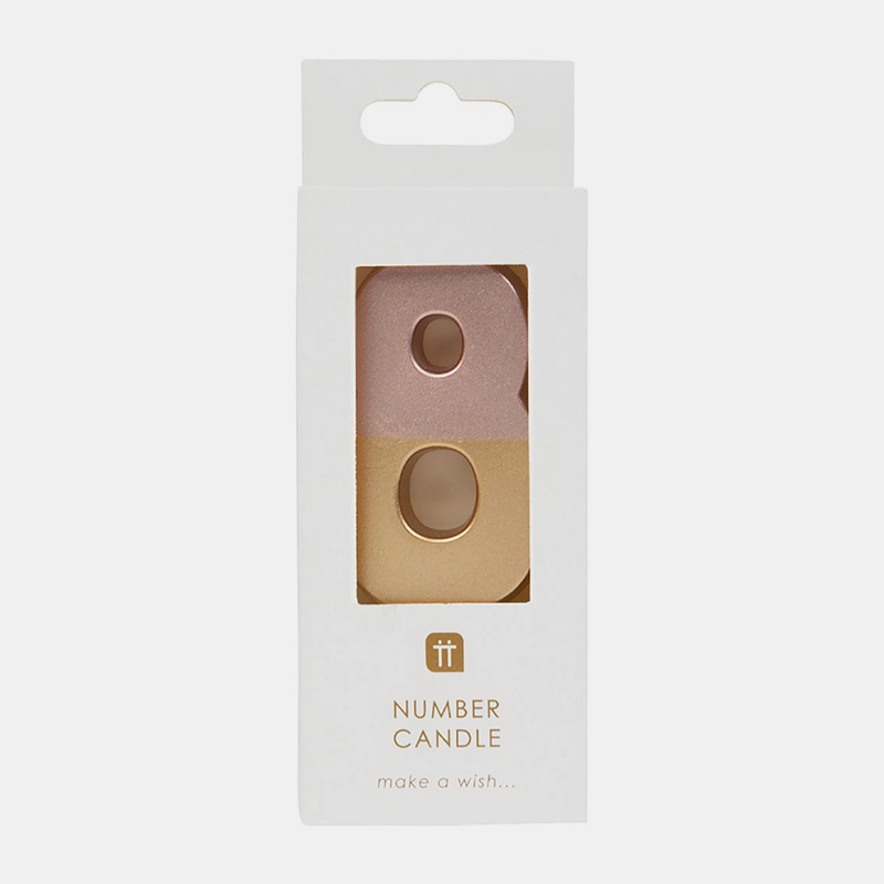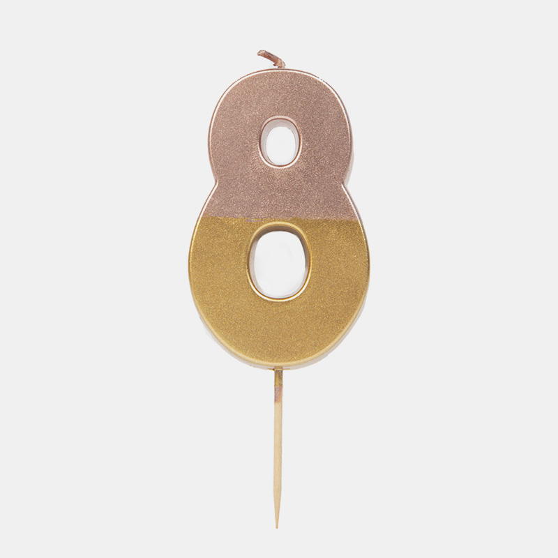 Añade un toque elegante a tartas de cumpleaños o aniversarios con esta vela número 8 en tonos rosa y dorado. No contiene purpurina, lo que la hace más ecológica.