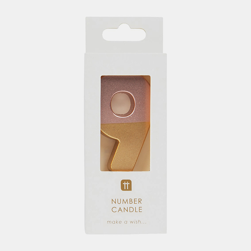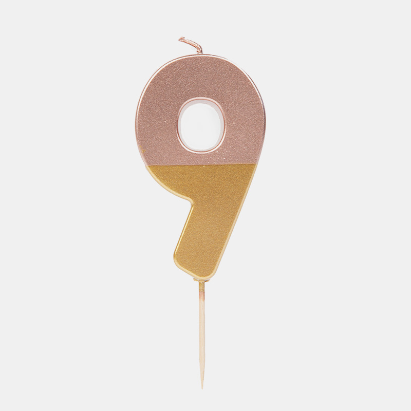 Añade un toque elegante a tartas de cumpleaños o aniversarios con esta vela número 9 en tonos rosa y dorado. No contiene purpurina, lo que la hace más ecológica.