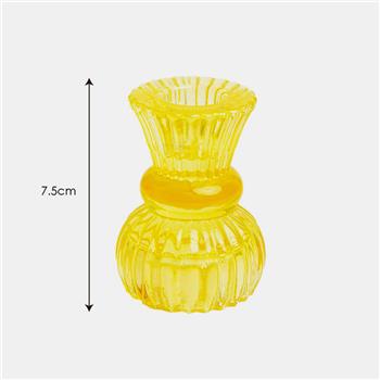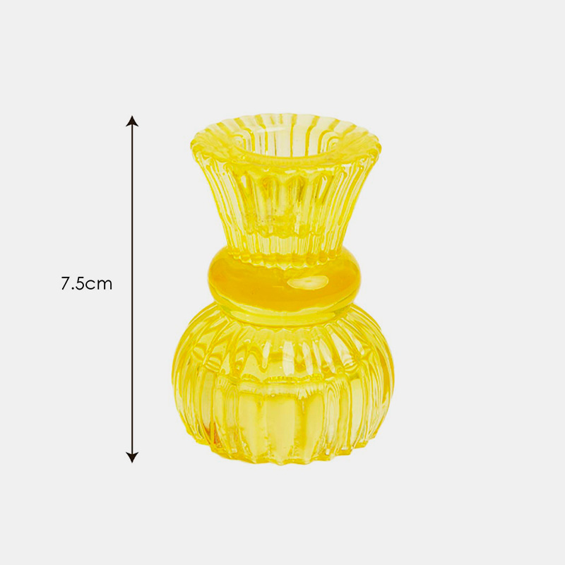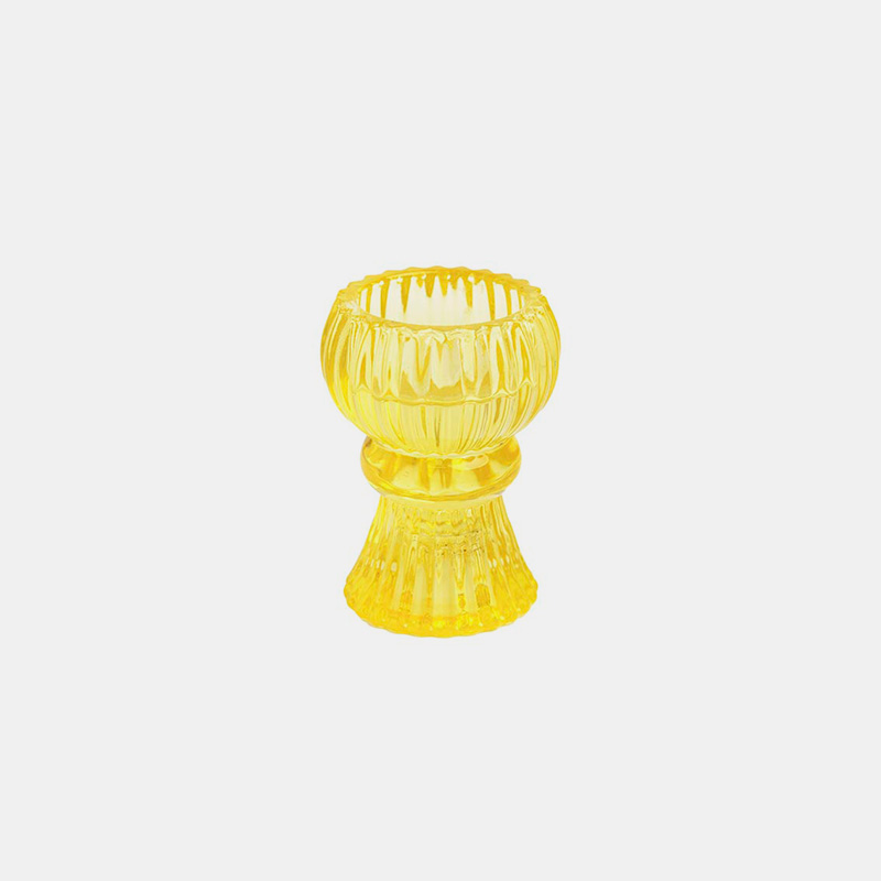 Este pequeño portavelas de vidrio amarillo aporta estilo y elegancia a cualquier ocasión. Su diseño versátil permite usarlo con velas de cena, velas tipo tealight o como jarrón pequeño (al voltearlo). Ideal para cenas románticas, fiestas, bodas o decoración del hogar. Tamaño: 7,5 cm de altoAgujero: 2 cm de ancho (vela estándar)Consejo: Si la vela no encaja, caliéntala ligeramente con agua o recorta la base.Producto sin plástico, packaging reciclable.
