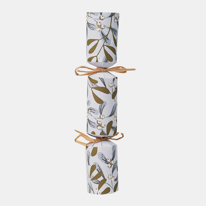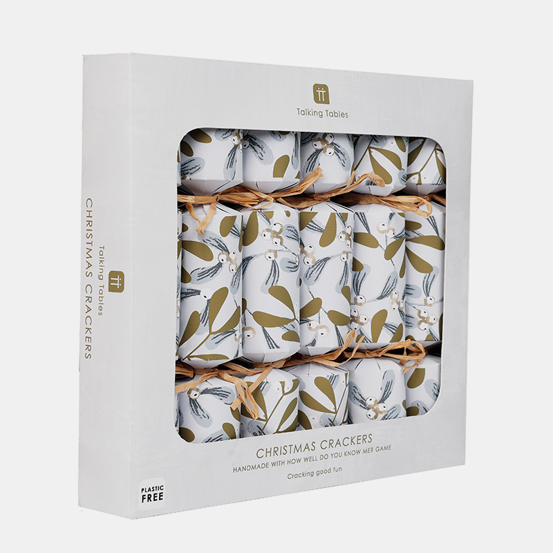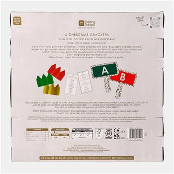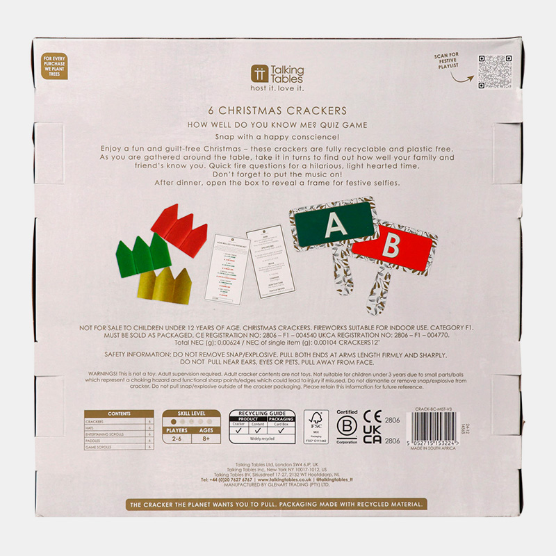Crackers navideños blancos con detalles dorados y plateados. Incluyen el juego ¿Cuánto me conoces?, gorros de papel y chistes. Caja con código QR para playlist navideña y se convierte en marco para fotos. Tamaño: 30 cmPack: 6 crackersMaterial: Papel FSC, sin plásticoJuego: 6 tarjetas + 6 paletas decoradas