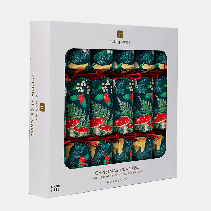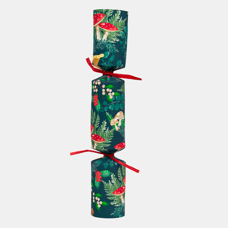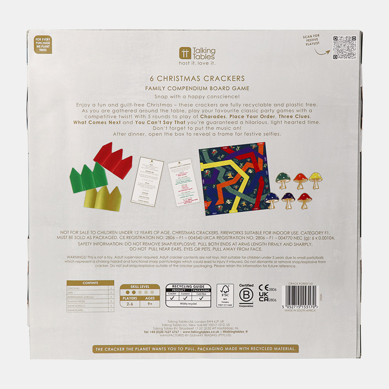 Crackers de bosque encantado con hongos y hojas. Incluyen corona, chiste y juego de mesa. Empaque con QR para música y marco de fotos. Todo reciclable y sin plástico. Pack: 6 unidadesTamaño: 30 cmContenido: Juego, corona, chiste