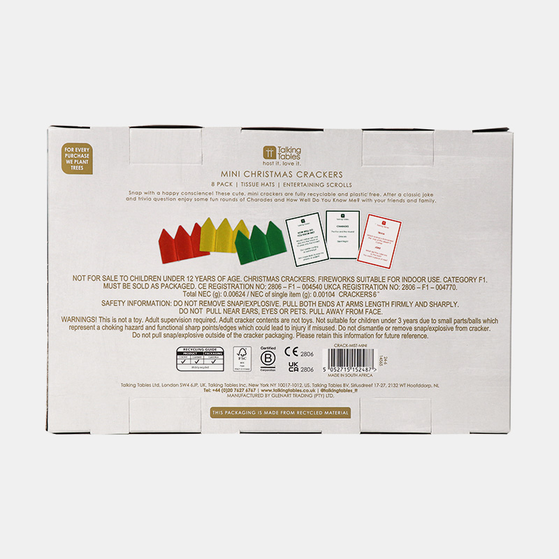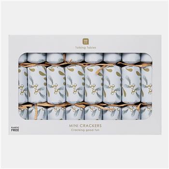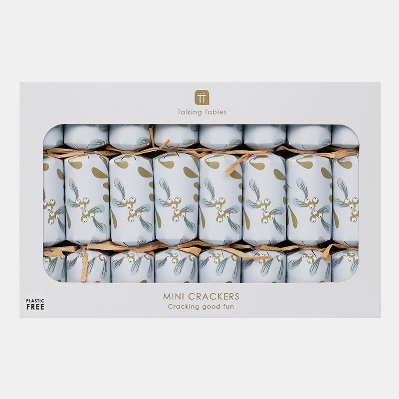 Mini crackers con diseño de muérdago en dorado y plateado. Incluyen corona, chiste, mímica y juego ¿Cuánto me conoces?. Plástico cero, papel de origen responsable. Pack: 8 unidadesTamaño: 15 cmContenido: 2 juegos, corona, chiste