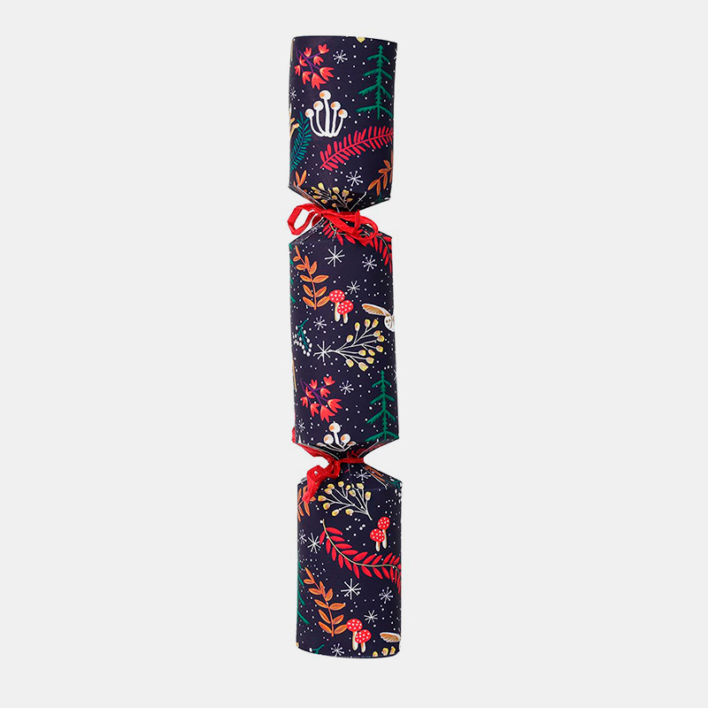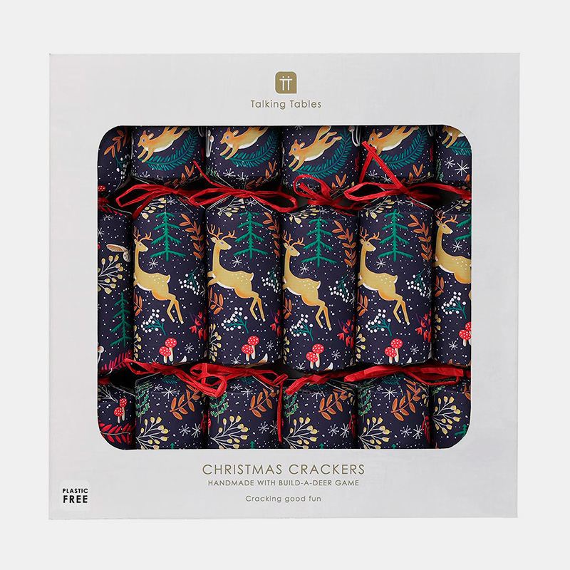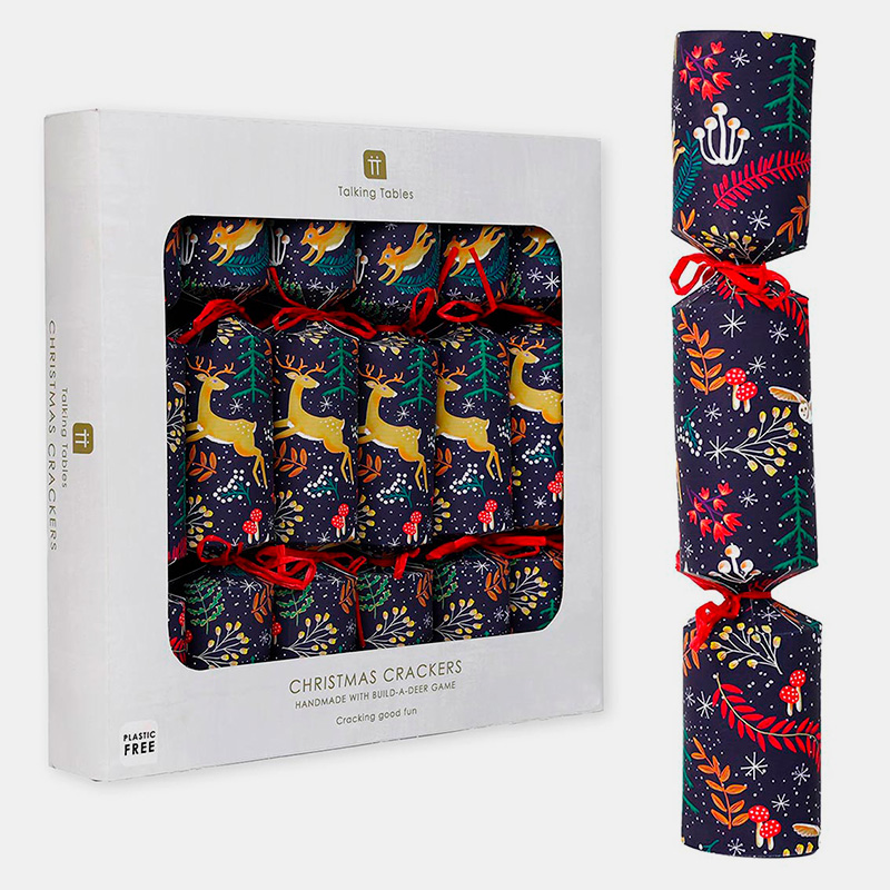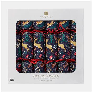 Crackers elegantes en azul noche con detalles de bosque. Incluyen corona y juego para montar un reno ("Reindeer Drive"). Diseño lujoso y perfecto para Navidad. Pack: 6 unidadesTamaño: 30 cmContenido: Corona, juego para montar reno