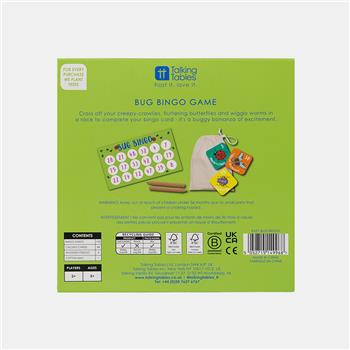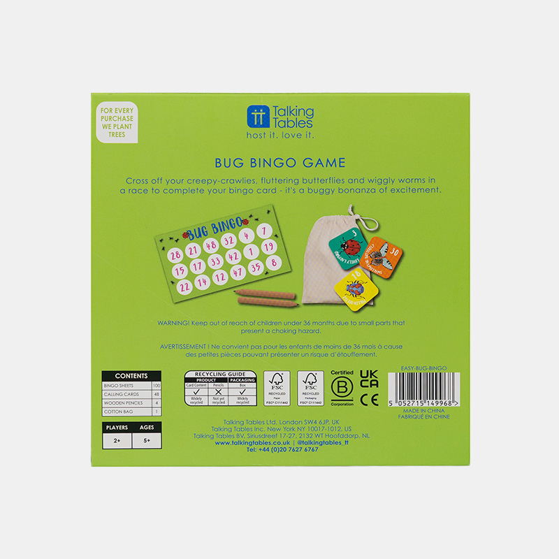 Divertido bingo con ilustraciones de insectos como mariposas, gusanos y más. Incluye 48 tarjetas, 100 hojas de puntuación, 4 lápices y bolsa de algodón. A partir de 5 años. Perfecto para viajes o regalos pequeños. Producto y empaque reciclables.