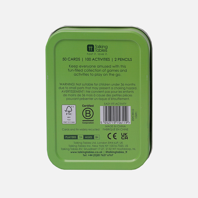 Lata con 50 tarjetas a doble cara (100 actividades): juegos, chistes, acertijos, laberintos, sopa de letras y más. Incluye 2 lápices. Ideal para viajes, cafés o días de lluvia. Tamaño portátil. Producto y empaque sin plástico.