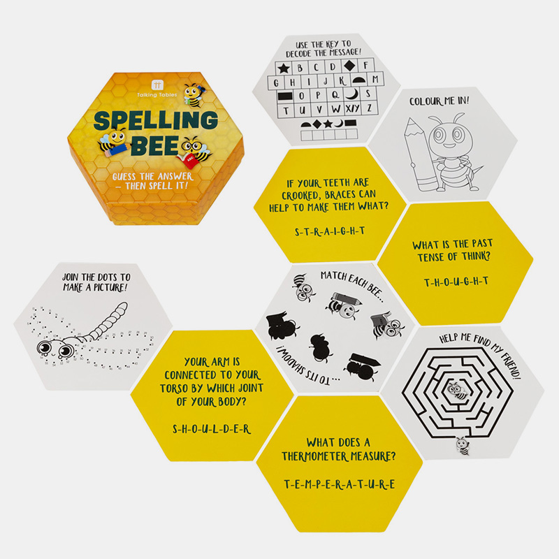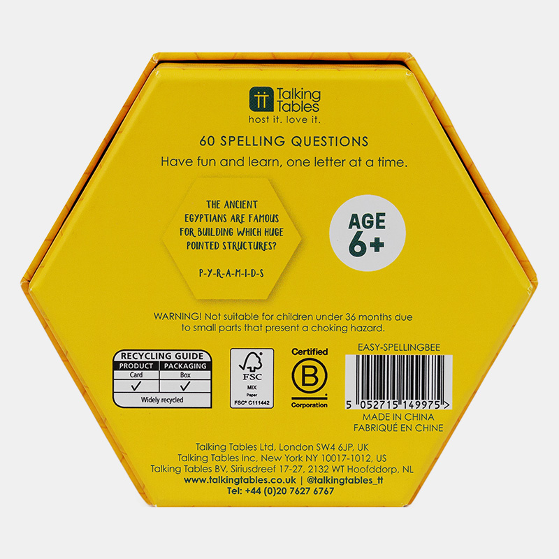 Versión divertida y colorida del clásico concurso de deletreo. Incluye fichas de letras y cartas con palabras para adivinar. Perfecto para fomentar la ortografía y vocabulario en niños. Incluye: 60 cartas a doble cara y más de 100 fichasJugadores: 2+Material: Cartón y papelProducto y empaque: Reciclables