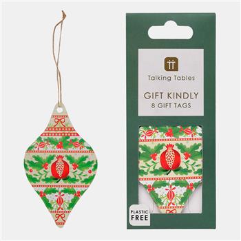 Etiquetas navideñas en forma de bola decorada con diseño de acebo y granada. Reciclables y sin plástico. Combinan con papel y bolsas de la colección Folklore. Tamaño: 10 cmPack: 8 unidadesRecomendación: Exponer junto a envoltorios y decoración coordinada