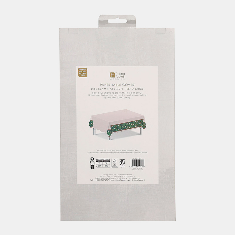 Mantel navideño extra grande con diseño inspirado en cuentos del este de Europa. Decorado con palomas, acebo y lazos rojos pintados a mano. Hecho de papel con textura de lino certificado FSC. Es reciclable y combina con las servilletas, crackers y otros accesorios de la colección Folklore. Tamaño: 2,3 m x 1,37 m