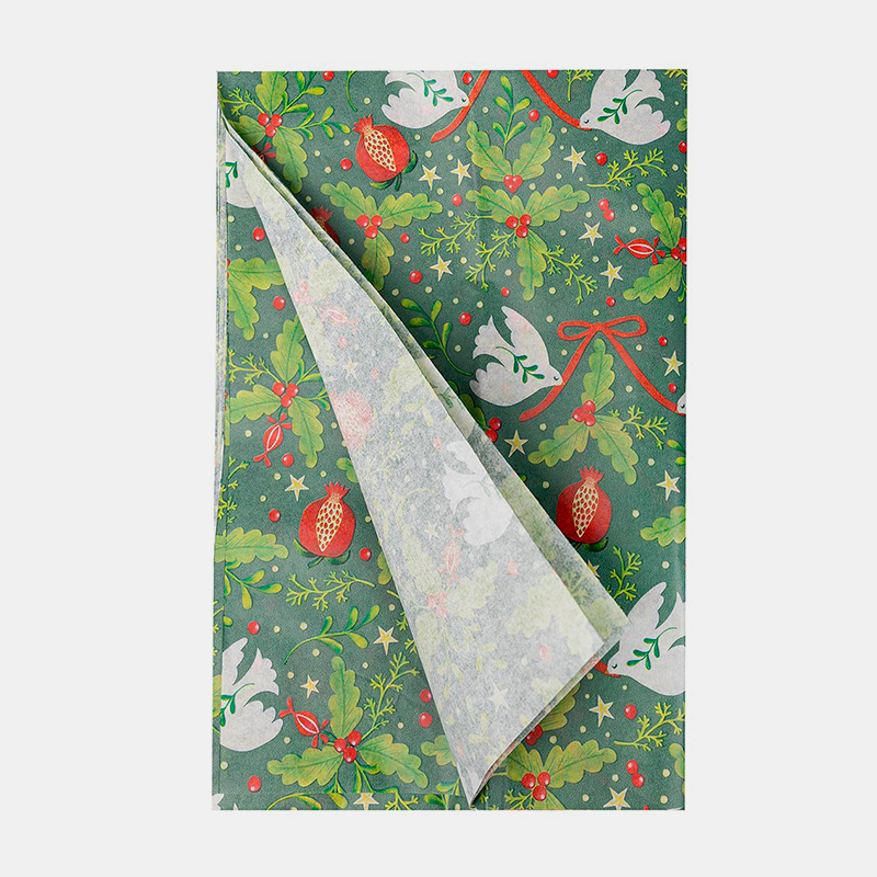 Papel de seda decorativo con diseño navideño pintado a mano de palomas, acebo y granadas. Ideal para envolver regalos en combinación con otros artículos de la colección Folklore. Fabricado con papel reciclable sin plásticos, certificado FSC. Tamaño hoja: 70 x 50 cm