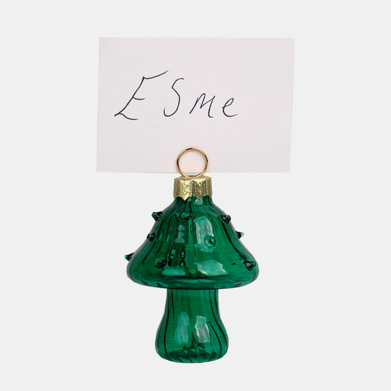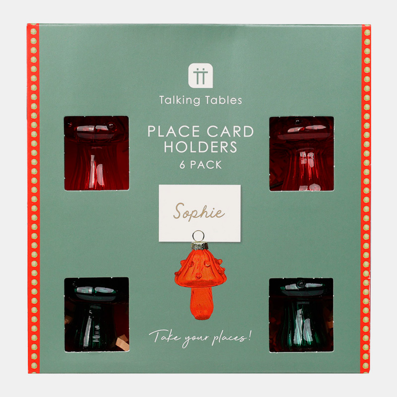 Sujeta tarjetas con forma de seta de vidrio en rojo y verde. Aportan un toque divertido y colorido a la mesa navideña. Se pueden reutilizar como adornos para el árbol de Navidad. Tamaño de cada seta: 7 x 4,5 cmPack: 6 unidades