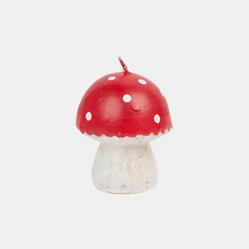 Vela pequeña con forma de seta roja, perfecta para decoraciones de bosque o fiestas de hadas. Se puede encender o usar como adorno decorativo. Tamaño: 7,5 cmRequiere base resistente al calor