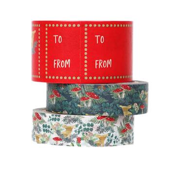 Pack de 3 cintas adhesivas de papel decoradas, parte de la colección “Gift Kindly”. Diseños coordinados con la colección Midnight Forest: 2 diseños de bosque y una cinta roja para usar como etiqueta. Sin plástico. Producto y packaging: Reciclables