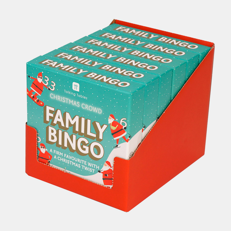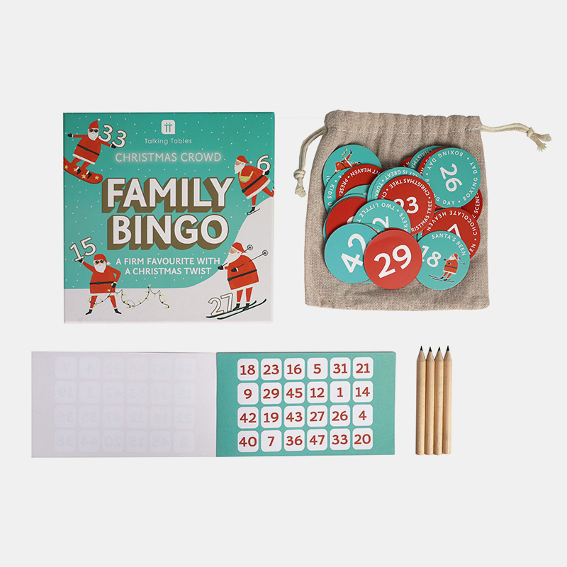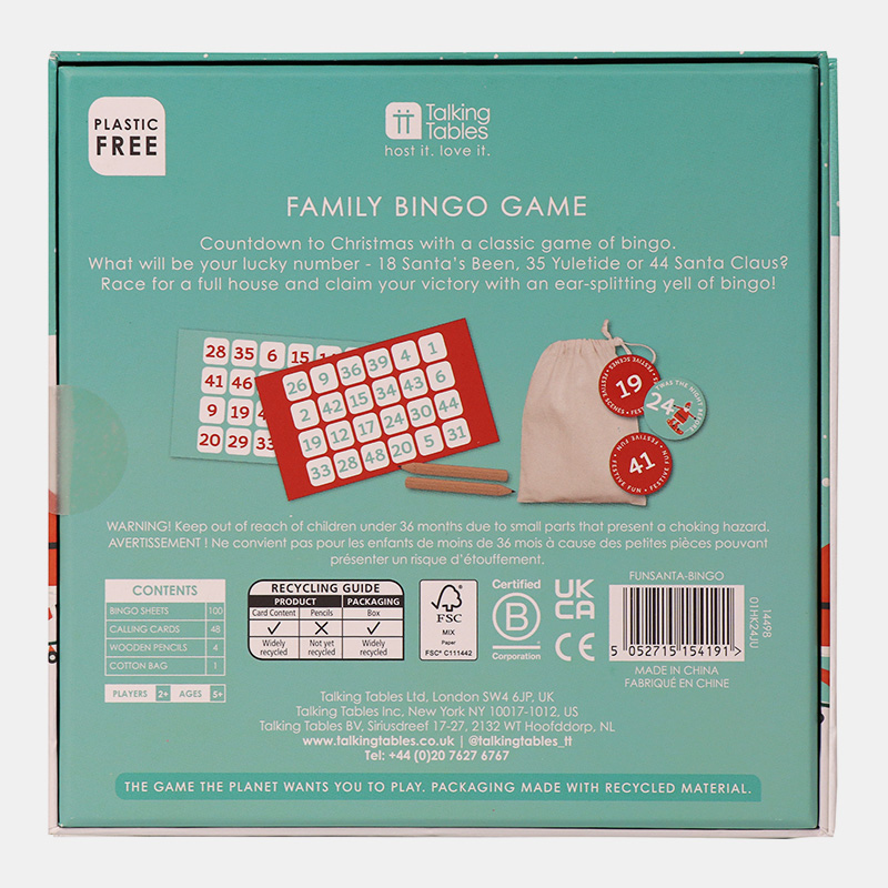 Versión navideña del clásico bingo con Santa ilustrado. Juego familiar ideal para todas las edades. Incluye 48 tarjetas, 1 bloc de puntuación (100 hojas), 1 lápiz y 1 bolsa de tela. Presentación en caja expositor de 6 unidades. Cómo jugar: completa una fila, columna, diagonal o el cartón completo.