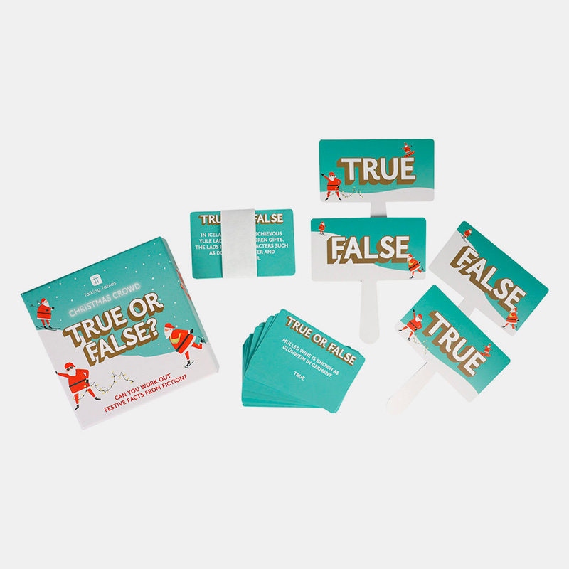 Juego rápido para toda la familia. Los jugadores deben levantar la paleta “True” o “False” en respuesta a afirmaciones navideñas. Contiene 60 tarjetas y 4 paletas. Ideal como regalo pequeño. Edad: 12+Incluye: 60 tarjetas, 4 paletasFormato: Unidad POS de 6 juegos
