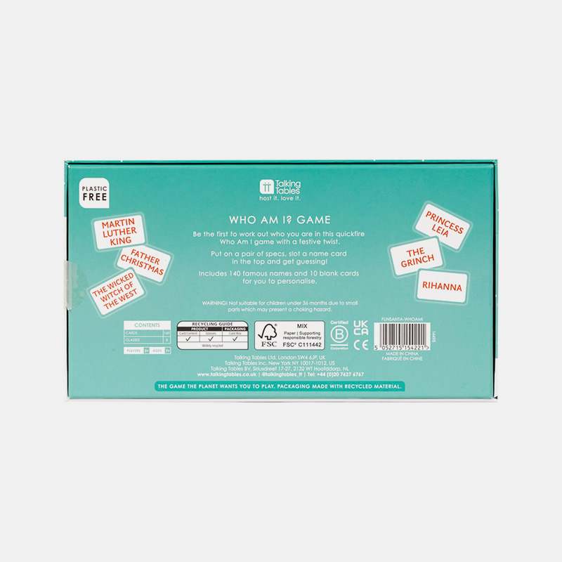 Juego clásico de “¿Quién soy?” con temática navideña. Incluye 80 tarjetas y 8 gafas para colocar las tarjetas. Los jugadores deben adivinar el personaje que llevan en la frente. Incluye: 80 tarjetas, 8 gafasEdad: FamiliarFormato: Unidad POS con 6 juegos