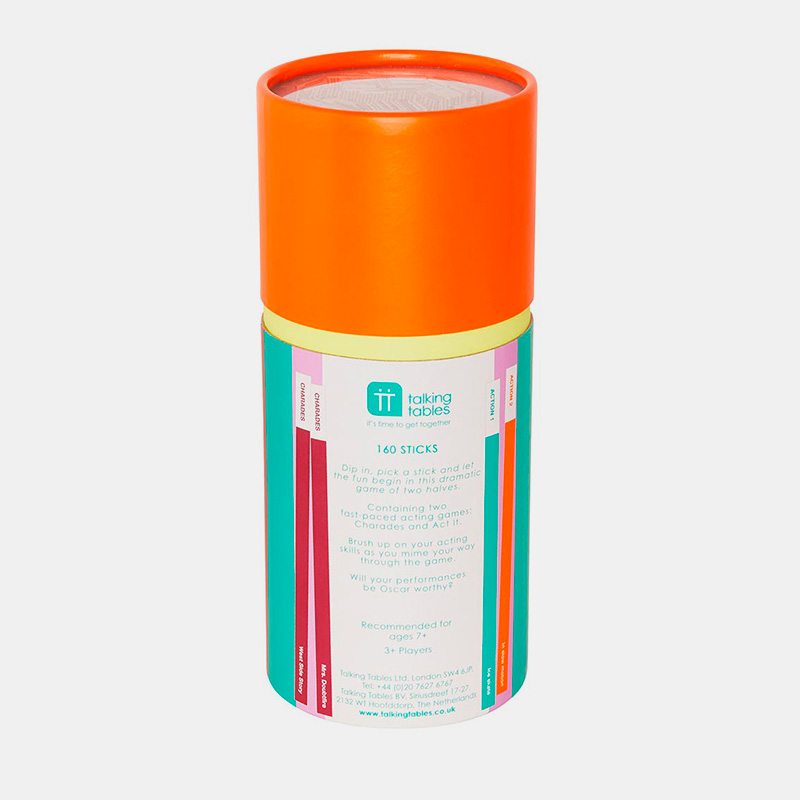 Juego familiar de mímica con 160 palitos a doble cara. Contiene dos juegos de actuación rápida: charadas y “actúa esto”. Gana quien adivine más rápido. A partir de 7 años. 2+ jugadores.