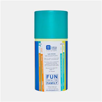 Juego familiar con preguntas de trivia, siglas o lógica. Cada palito tiene una pregunta para niños (lado naranja) y otra para adultos (lado azul). 160 palitos. A partir de 10 años.