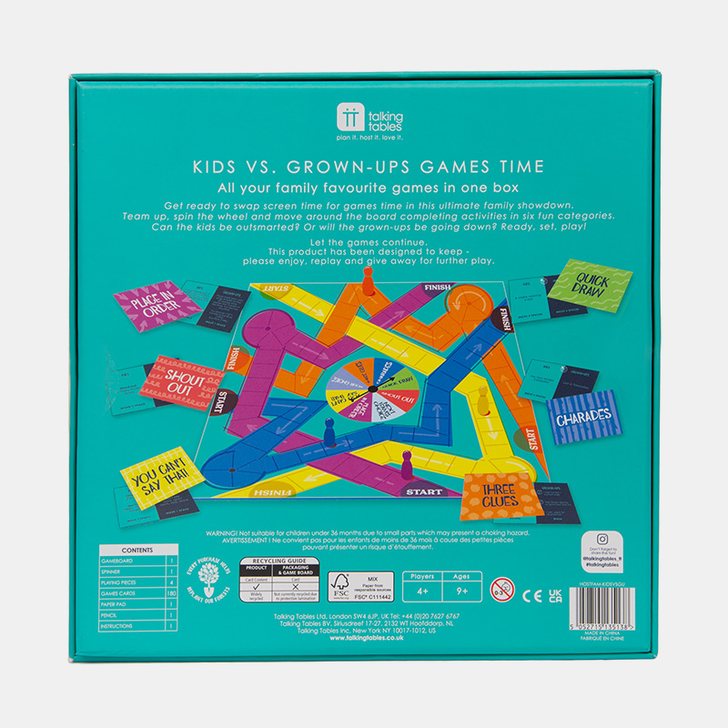 Juego de mesa donde niños y adultos se enfrentan en 6 minijuegos distintos. Gana tu camino hasta la meta a base de risas, dibujos y desafíos. Edad: 9+. Jugadores: 4+.