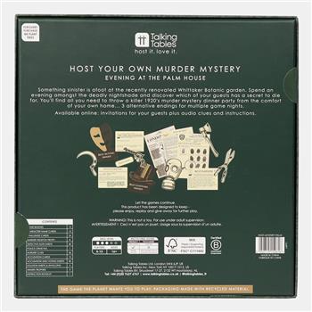 Edición ambientada en los jardines Whittaker, años 20. Alguien ha sido asesinado entre las plantas exóticas... ¡descubre al culpable! Juego rejugable con 3 finales alternativos. Incluye 12 personajes, pruebas, pistas, tarjetas de votación y accesorios. Ideal para 5–12 jugadores. Edad: 16+.