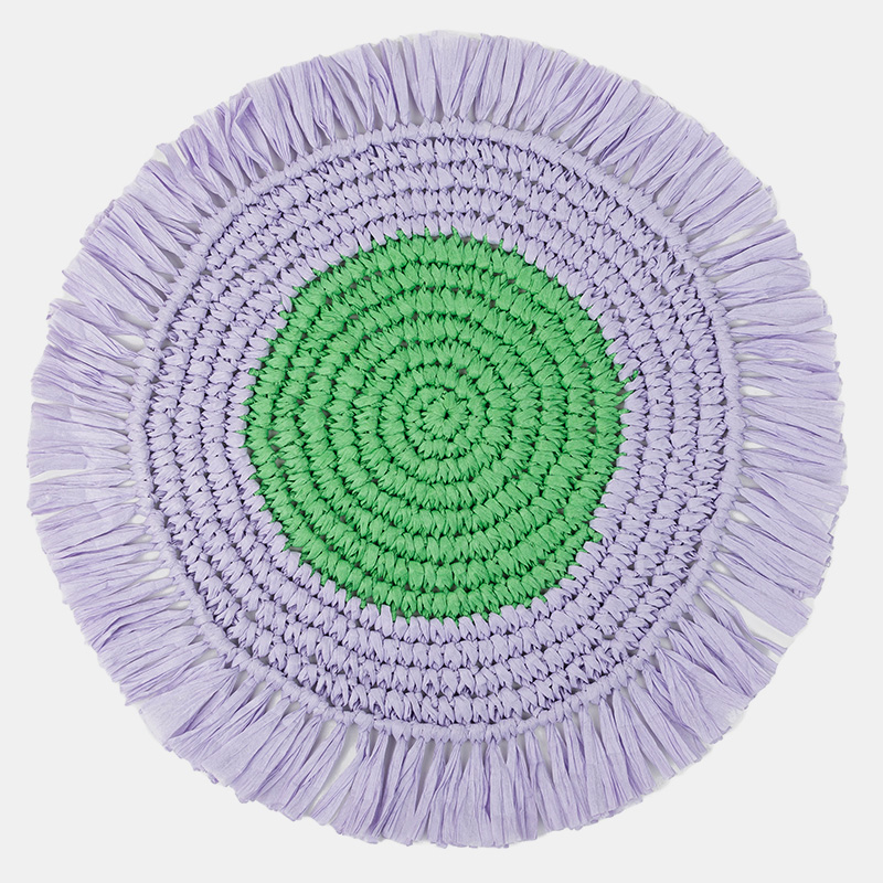 Set de 2 individuales hechos a mano en Vietnam con rafia sostenible. Diseño vibrante en lila y verde. Se pueden usar como base para platos o centros de mesa. Tamaño: 30 cm. Producto duradero, empaque reciclable.