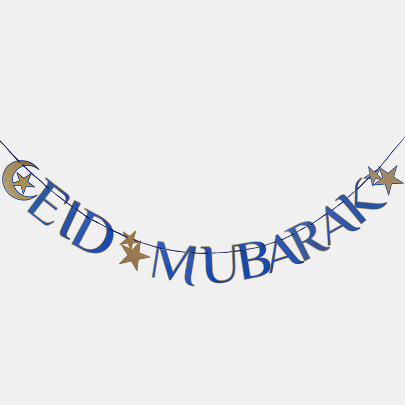 Guirnalda de cartulina con texto “Eid Mubarak” en azul marino y dorado. Incluye diseño de estrella y luna. Reutilizable y reciclable. Tamaño: 3 m.