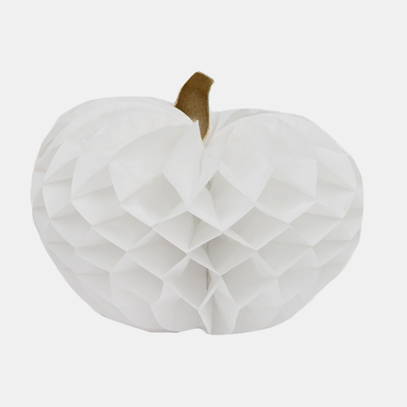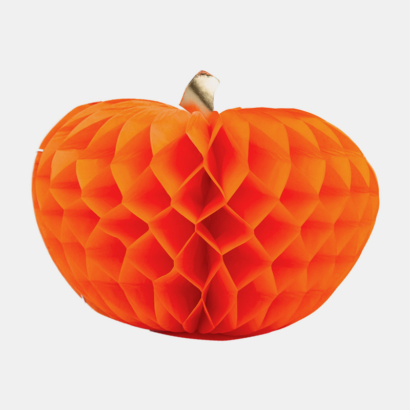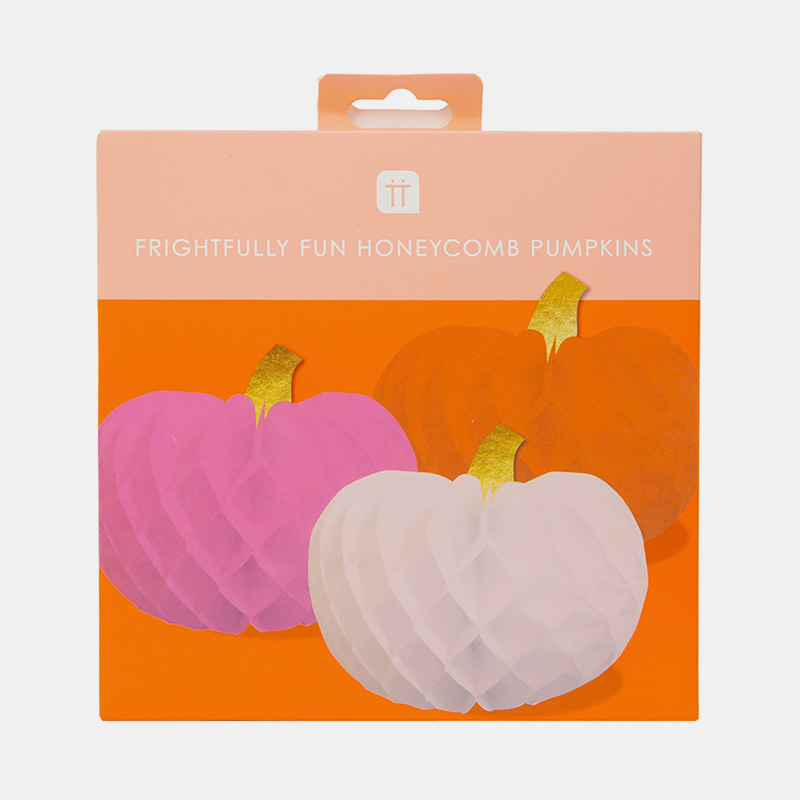 Pack de 3 calabazas de papel en colores rosa, naranja y blanco. Reutilizables. Ideal para decorar mesas o vitrinas en Halloween. Se montan fácilmente con clips. Producto y empaque: Reciclables