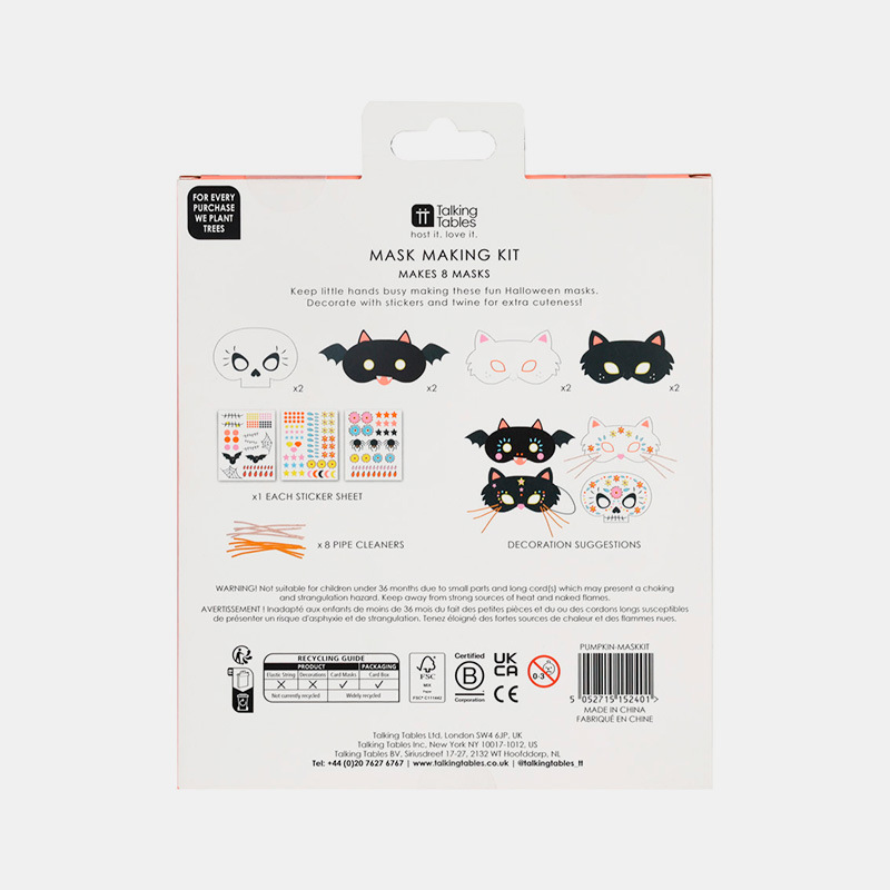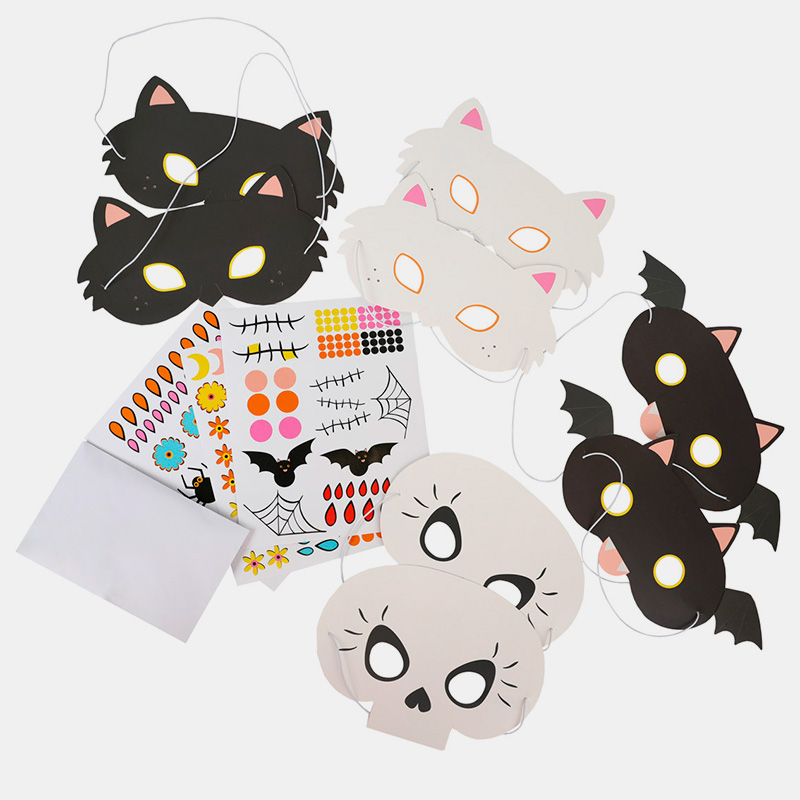 Kit para crear máscaras de Halloween. Incluye 8 máscaras en 4 diseños y 3 hojas de pegatinas para decorar. Actividad creativa para niños en otoño. Tamaño: 18,5 cmIncluye: 8 máscaras + 3 hojas de pegatinas