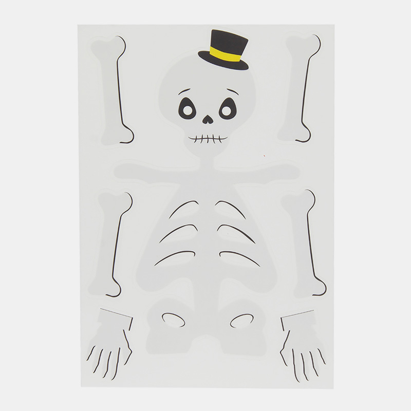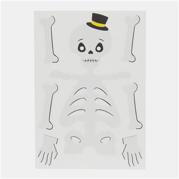 Set de 6 hojas de pegatinas estáticas reutilizables para ventanas con diseños de esqueletos y calabazas. Se adhieren sin pegamento, aptas para uso infantil. Reutilizables y sin desorden.