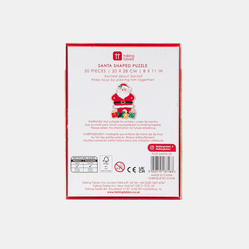 Puzle con forma de Papá Noel. Ideal para niños desde 3 años, incluye 50 piezas. Presentado en caja pequeña, ideal como regalo, relleno o impulso en punto de venta. Tamaño montado: 18,5 x 28 cm.