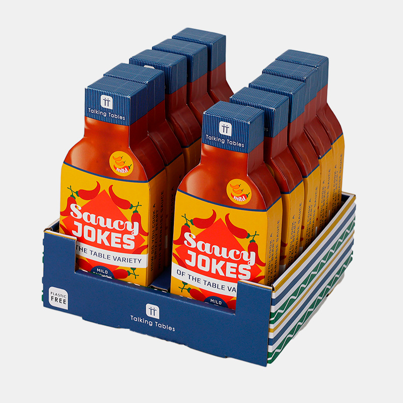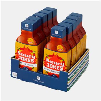 Caja en forma de botella con 60 tarjetas con chistes sobre salsas del mundo. Humor familiar ideal para cenas o fiestas. Se presenta en unidad de punto de venta con 10 cajas. Gran opción para regalo o venta impulsiva.