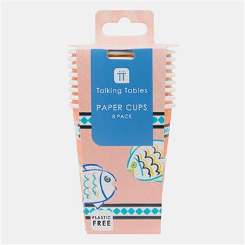 Vasos de papel con diseño de peces. Ideales para bebidas frías en fiestas de verano. Con espacio para escribir el nombre. Capacidad: 250 ml Pack: 8 vasos Producto y embalaje: Biodegradables y reciclables