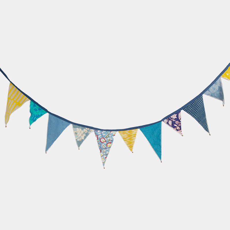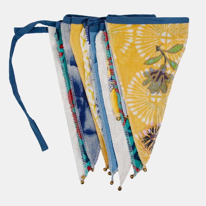Guirnalda hecha con retales de algodón reciclado. Cada una es única, con flecos y campanitas. Colores: azul, amarillo y blanco. Tamaño: 3 m, 12 banderines Material: Algodón reciclado 100% Producto: Reutilizable Embalaje: Reciclable