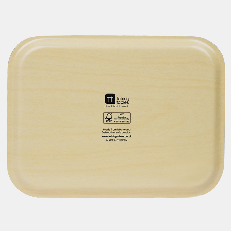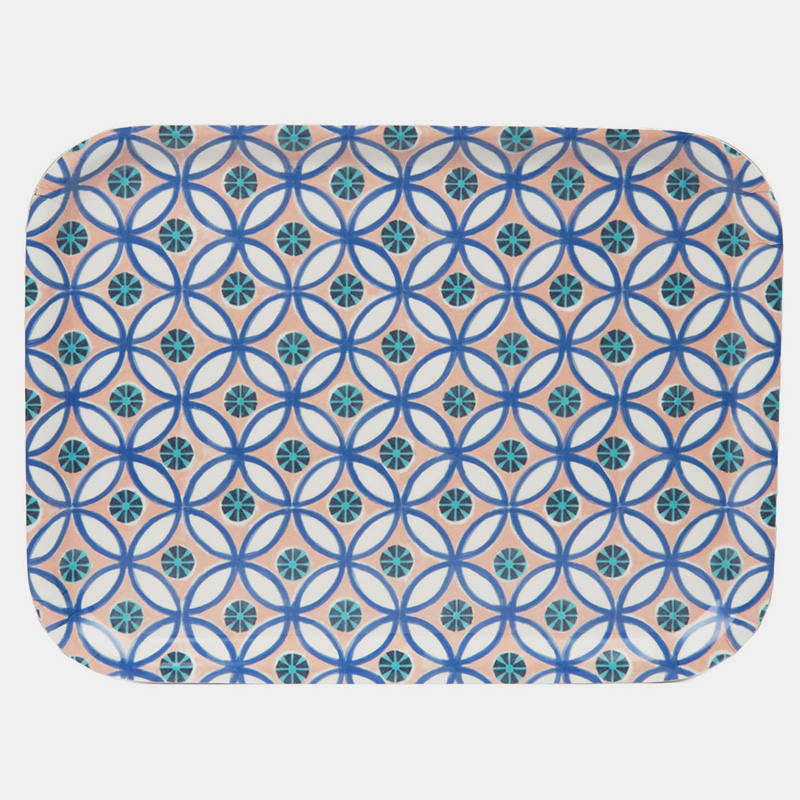 Bandeja de madera de abedul con patrón geométrico en rosa, azul y verde. Fabricada en Suecia. Ideal para servir bebidas o como decoración de cocina. Tamaño: 27 x 20 cmProducto: ReutilizableEmbalaje: Reciclable