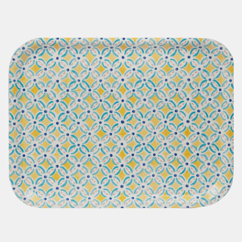 Bandeja de madera de abedul con diseño soleado amarillo y azul, inspirada en los zocos marroquíes. Ideal para cócteles en jardín. Tamaño: 27 x 20 cmProducto: DuraderoEmbalaje: Reciclable