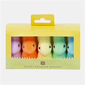 Set de 5 conejitos pastel flocados para decorar tu mesa en Pascua. Perfectos como marcadores de sitio o para crear un centro de mesa con nuestro camino de césped. También se pueden esconder para una búsqueda de huevos. Tamaño: 7,5 cm Pack: 5 conejitos