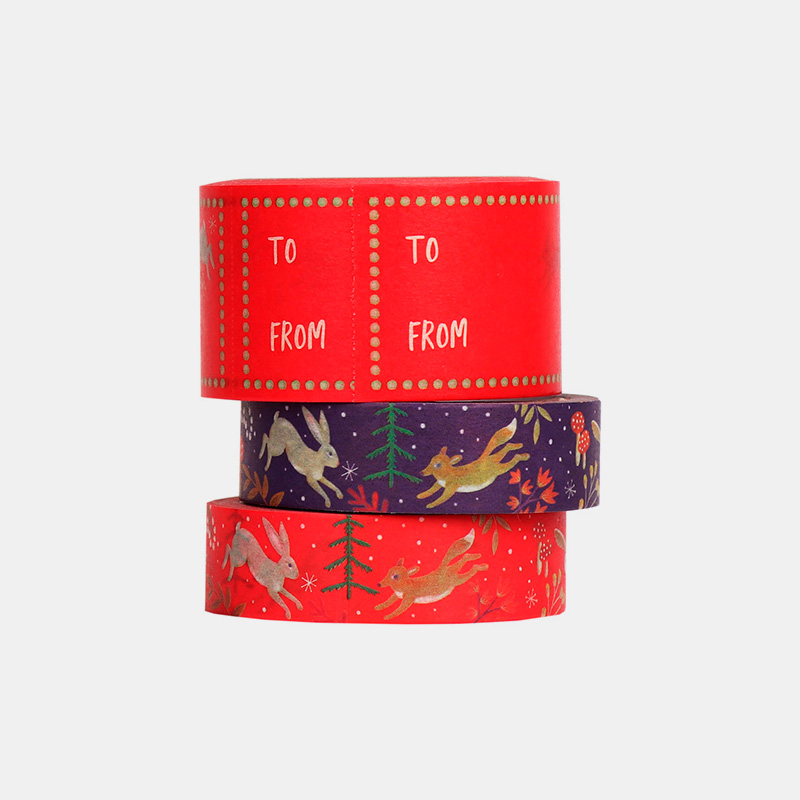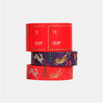 Pack de 3 cintas adhesivas de papel con diseños: clásico Twilight, búho sobre fondo rojo y uno tipo etiqueta para nombre. Fabricadas con papel de bosques sostenibles. Alternativa ecológica a la cinta plástica.