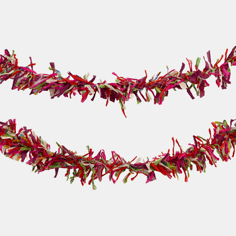 Guirnalda tipo espumillón hecha con retales de algodón 100% reciclado. Alternativa sostenible y colorida a la clásica decoración navideña. Fabricada en India. Tamaño: 3 m
