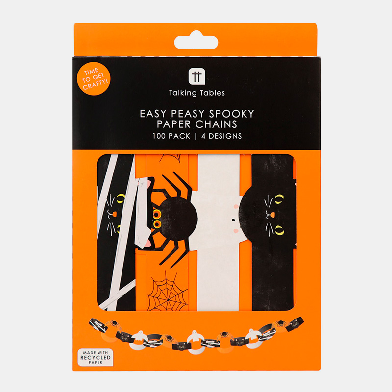 Pack de 100 tiras para montar 6,5 m de cadena decorativa de Halloween. Diseños de gatos, fantasmas y arañas. Actividad divertida para niños. Requiere solo enrollar y pegar. Tamaño montado: 6,5 m