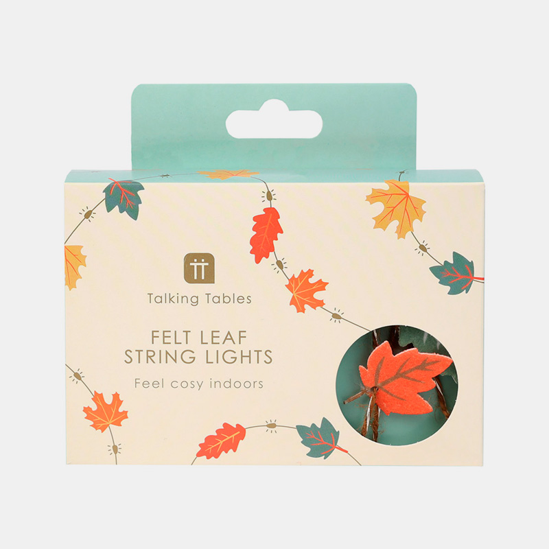 Guirnalda de luces LED rodeadas de hojas de fieltro en tonos otoñales: óxido, mostaza y verde oliva. Ideal para estanterías, chimeneas o escaleras. Funciona con 3 pilas AA (no incluidas). Tamaño: 2 m, 16 luces LED Producto: Reutilizable Embalaje: Reciclable