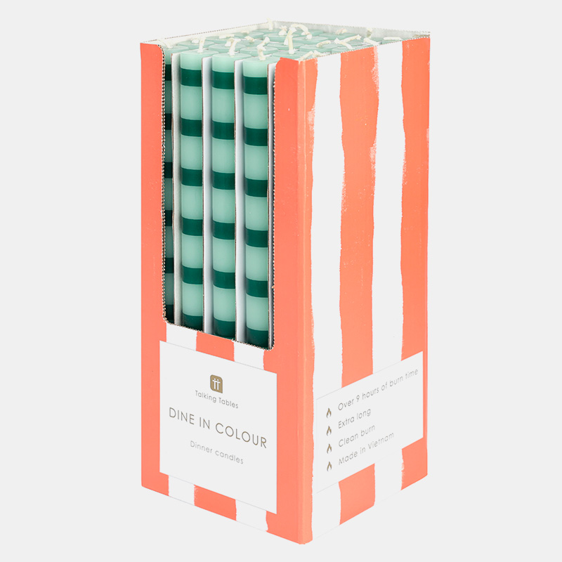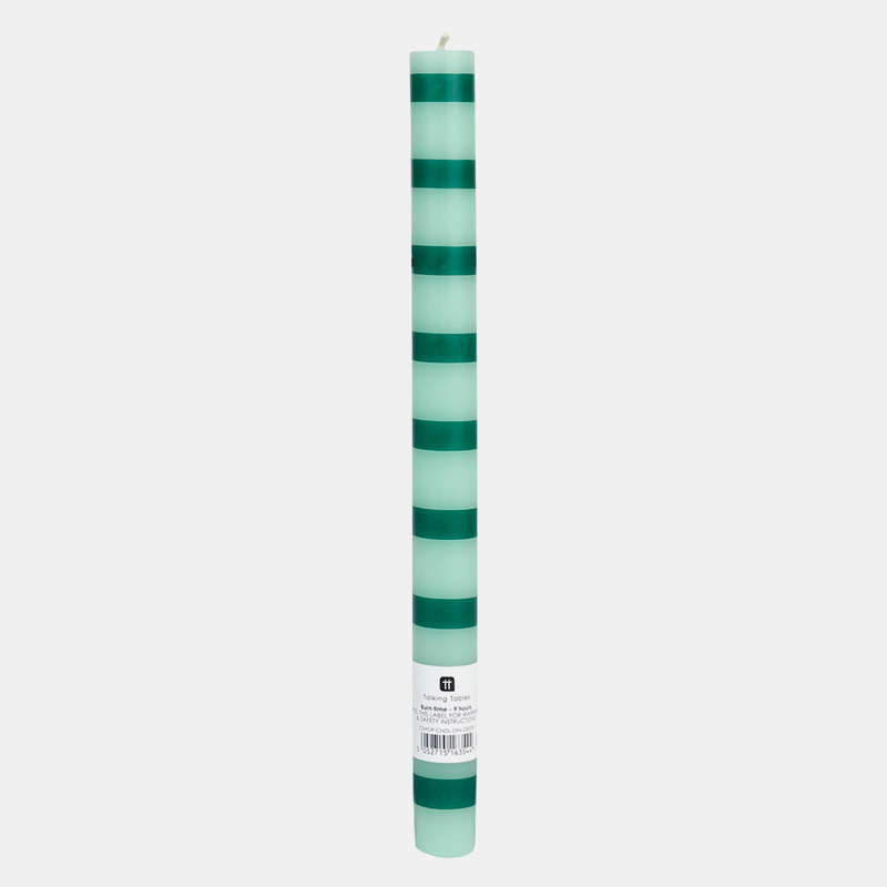 Vela de rayas verdes y blancas con diseño tipo caramelo. Ideal para mesas navideñas o decoración invernal. Tamaño: 28 cm Pack POS: 25 unidades Producto: Diseñado para durar Embalaje: Reciclable