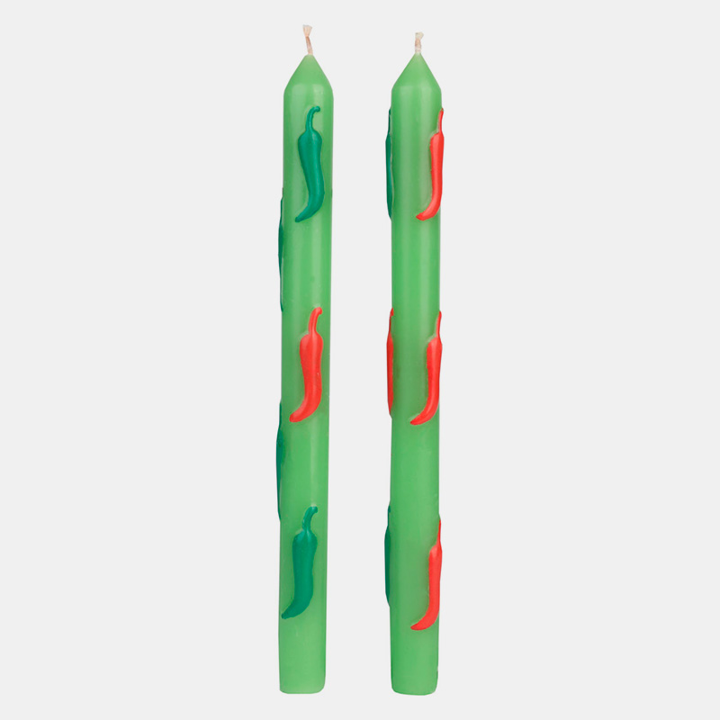 Velas cónicas verde salvia con un diseño 3D de chile, pintadas a mano en Vietnam. Perfectas para una decoración gastronómica o temática picante. Tamaño: 25 cm Pack: 2 unidades Producto: Desechable Embalaje: Reciclable