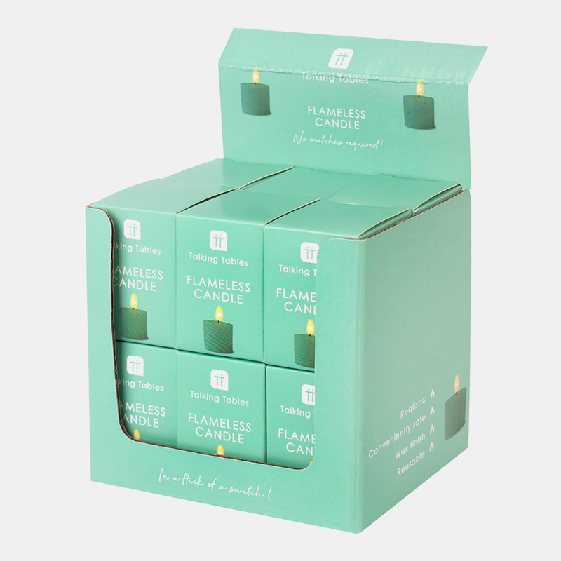 Vela LED sin llama en base verde salvia. Segura, reutilizable y decorativa. Ideal para hogares con niños o mascotas. Tamaño: 5 cm Batería: 3 x LR44 Producto: Reutilizable Embalaje: Reciclable